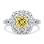 Ladies 18K White Gold Double Halo Split Shank Engagement Ring with Fancy Yellow Cushion Cut Diamond – 1.49 ct Total Diamond Weight