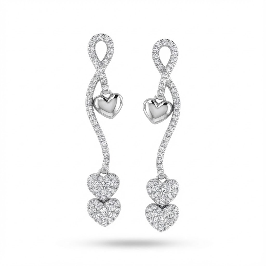 Romantic with a refined twist. These graceful diamond dangle earrings feature a sculptural, twisting silhouette that leads into shimmering heart-shaped drops. With 1.10 carats of pave-set diamonds, they radiate warmth and elegance—perfect for moments that matter or simply making a statement of love.