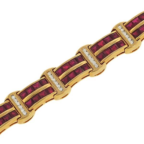 Unit price perA bold composition of color and light. This striking bracelet features two perfectly balanced rows—128 square-cut rubies rich in crimson fire and 96 round diamonds that shimmer with elegance. With over 8.50 carats of combined gemstone brilliance, all channel-set in warm 14K yellow gold, this piece is a celebration of beauty in precision—fiery, radiant, and utterly unforgettable.