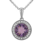 A breath of violet radiance framed in light. This enchanting pendant showcases a 1.41cttw round amethyst in a classic prong setting, embraced by a halo of pavé diamonds totaling 0.07cttw. Suspended from a refined rolo link chain, it’s a graceful expression of color, light, and femininity.