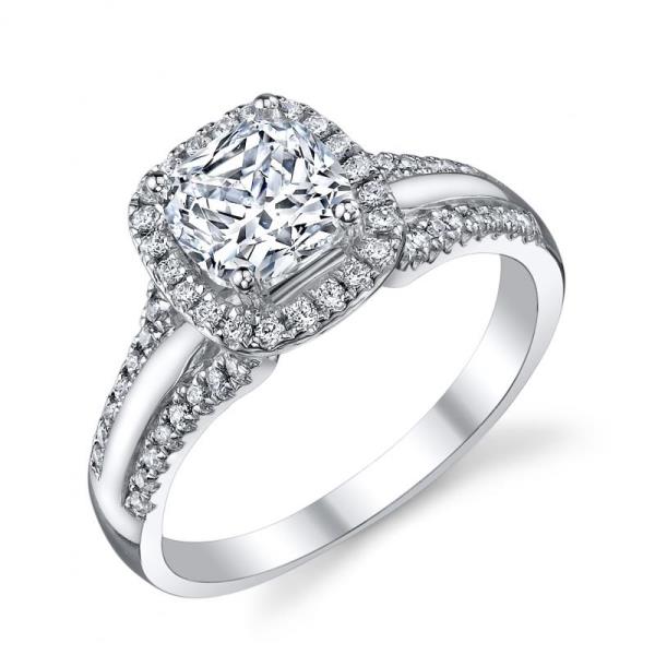 Unit price perRomantic curves, radiant sparkle. This 14K white gold engagement ring features a cushion-shaped halo of pavé-set diamonds designed to amplify the beauty of your cushion cut center stone. Crafted as a semi-mount, it fits a center diamond ranging from approximately 1/3 to 1 1/4 carats — a graceful and timeless setting that captures light and love with every glance.
