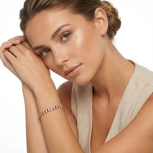 Unit price perA feminine twist on a timeless symbol, this toggle bracelet is plated in warm 24-karat rose gold over bronze. The bold link design is finished with a romantic lock and key charm, capturing the essence of lasting love and elegance.