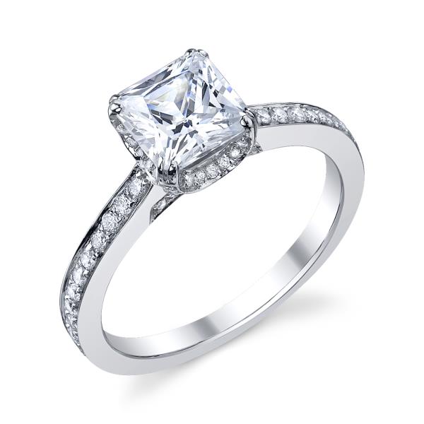Ladies 14K White Gold Pavé Princess Cut Engagement Ring – Semi-Mount for 0.42–1.25 ct Cushion Cut Center Stone (Center Stone Not Included)