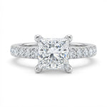 A modern icon of brilliance and elegance. This exceptional engagement ring in 14K white gold showcases a 1.19 carat princess cut center diamond, graded E color and VS1 clarity, offering pristine sparkle and sharp geometry. Set atop a pavé band adorned with 18 round brilliant diamonds totaling approximately 0.63 carats, this ring delivers timeless beauty with contemporary refinement. With a combined total diamond weight of 1.82 carats, it is a radiant expression of everlasting love.