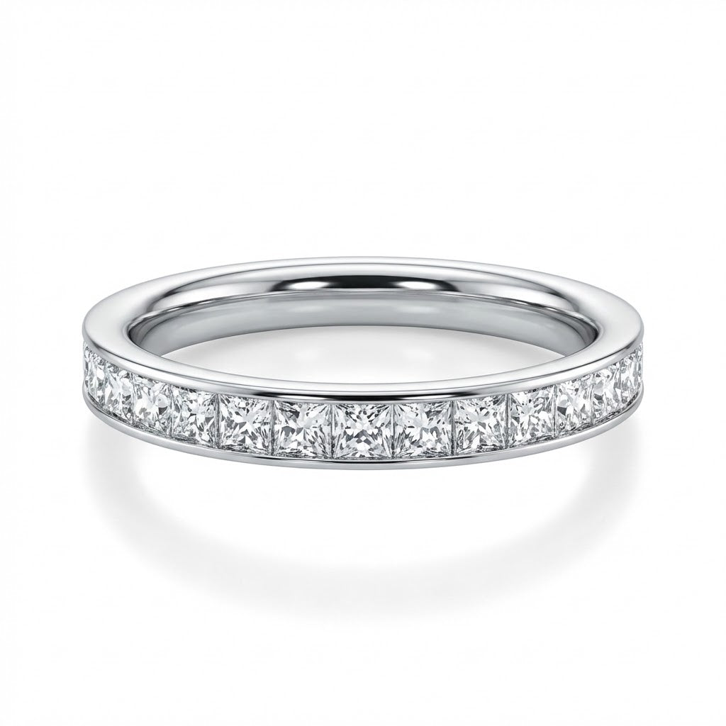 A refined symbol of forever, this platinum eternity band features princess-cut diamonds channel set in a continuous circle of brilliance. With approximately 1.10 carats of radiant sparkle, each stone reflects a promise, a memory, a moment. Crafted in platinum for lasting beauty, it’s a piece that speaks of love without end.