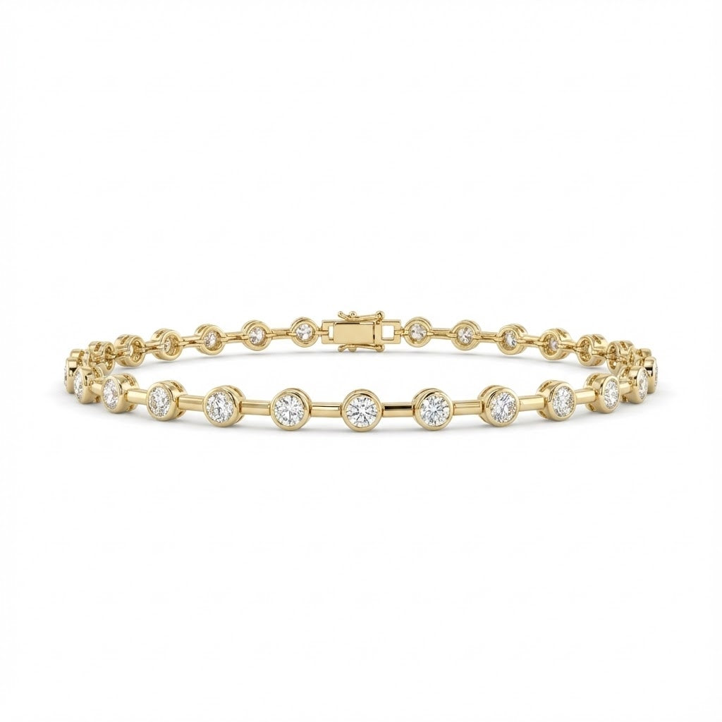 A timeless strand of brilliance. This classic tennis bracelet features nearly 3.00 carats of round brilliant diamonds, each one prong-set in warm 14K yellow gold to create a continuous line of fire and light. Designed to move with you and reflect your radiance, it’s a piece that belongs as much to everyday elegance as it does to unforgettable nights.