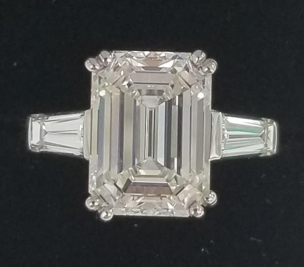 PLT three stone diamond engagement ring with two side stones, tapered baguettes, Color: H, Clarity: VVS2, 5.63cttw. Center stone Emerald cut, Weight: 5.01ct, Color: I, Clarity: VVS2, GIA cert.