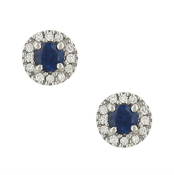 14K White Gold Blue Sapphire and Halo Style Pave Diamond Stud Earings. ||| Gem: 0.46cttw ||| Diamond: 0.14cttw ||| Stone Count: 26