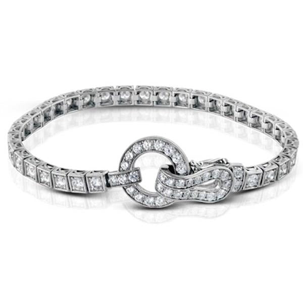 Sculpted to shimmer, designed to empower. This bold yet refined bracelet features sculptural links entirely pavé-set with nearly 5.00 carats of round brilliant diamonds. Crafted in luminous 18K white gold, it wraps the wrist in radiant texture and light—striking from every angle, timeless in every moment.